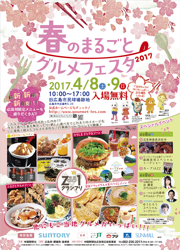 春のまるごとグルメフェスタ2017 2017 http://www.gourmet-fes.com 春のまるごとグルメフェスタ2017 新聞広告シリーズ AD:金具智子 D:下園朋子 D:中園 響 版画:大世渡縁 PR:株式会社アシスト ADV:中国新聞社