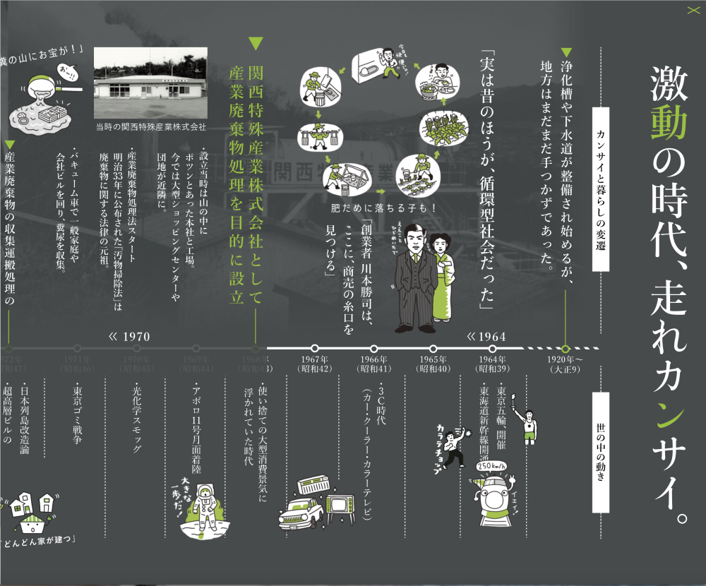 創業50年を記念してカンサイと世の中の動きの50年史を横スクロールで。