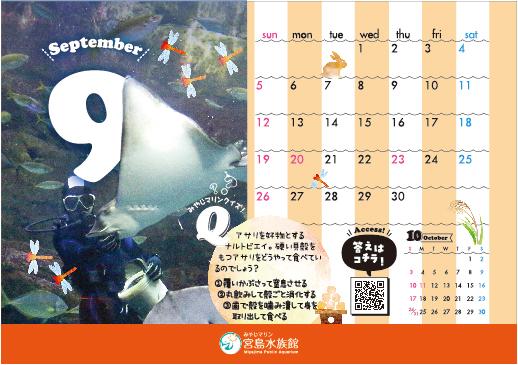 水族館の2021年卓上カレンダー 2021 自粛ムードが続く中で2021年は卓上から日々に彩りを添えられるようカラフルなデザインに。 かわいい海のいきものたちに水彩テクスチャのコラージュイラストをあしらったクイズ付きカレンダー。 AD:金具智子 D:下園朋子 ADV:宮島水族館