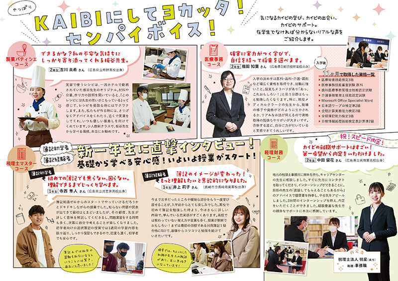 専門学校 情報誌 KAIBI REPORT 2021 https://www.kaikei.ac.jp/ 専門学校のオープンキャンパスや在学生の旬な情報を掲載した 2つ折りA5サイズのミニ情報誌 AD:金具智子 D:下園朋子 i:下園朋子 C:徳山典子(徳山広告制作室) ADV:学校法人上野学園
