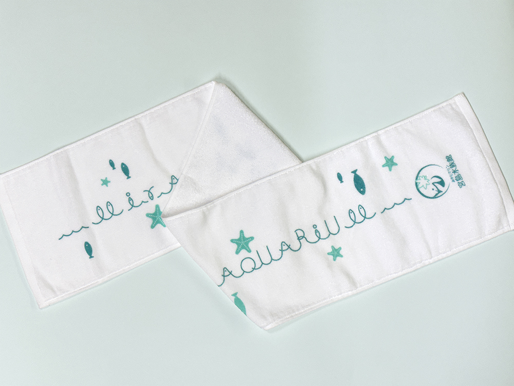 おさかな文字マフラータオル 2023 8月1日の宮島水族館の日に配布された限定の来場者ノベルティ。 水族館の名称を波やおさかなを模した「おさかな文字」でデザイン。 AD:下園朋子 D:下園朋子 ADV:宮島水族館