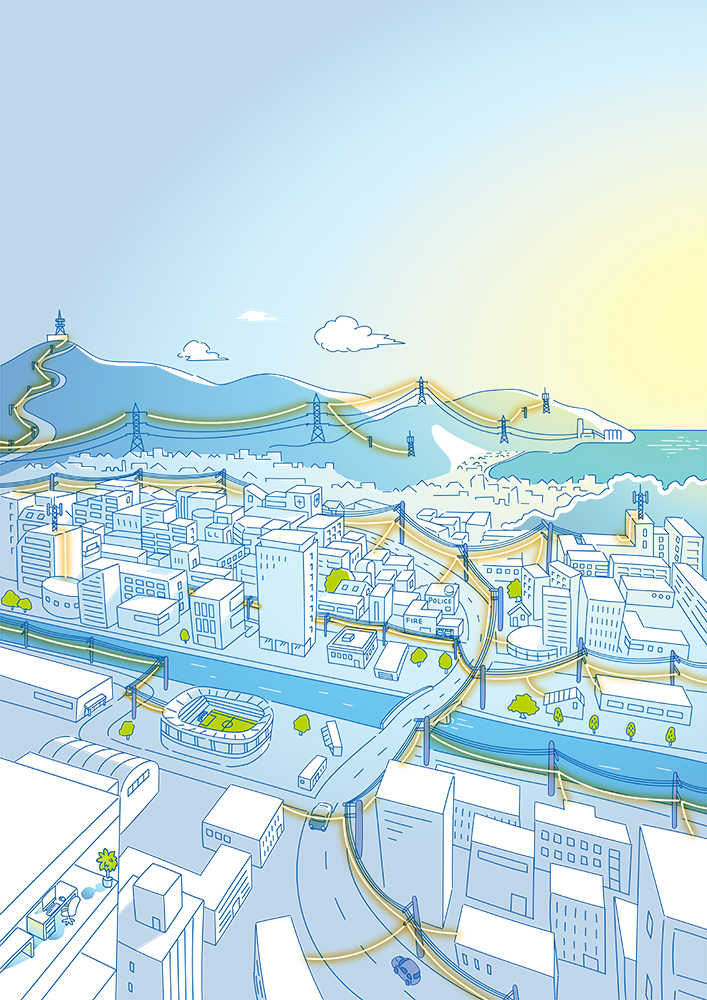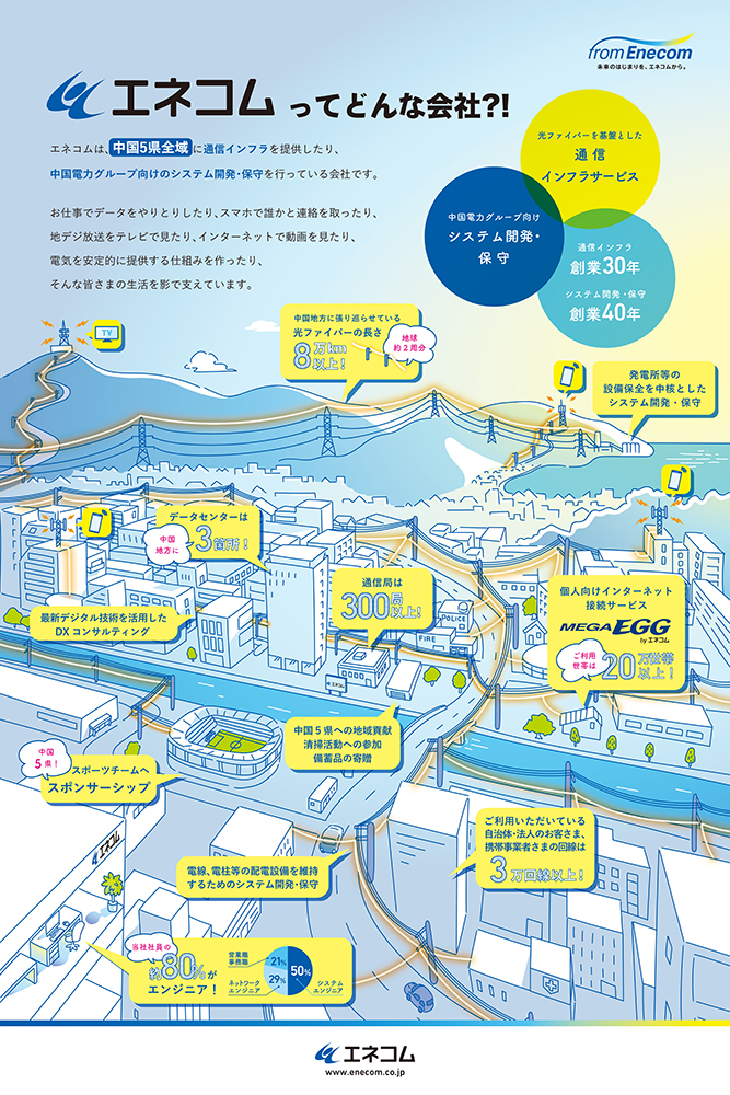 企業アピール大型パネル 2025 サッカーのスポンサードゲーム来場者に向けてスポンサー企業について知っていただくための大型パネル 日常の暮らしのどんな所に企業が関わっているのかを架空の街のイラストを用いて表現 AD:下園朋子 D:下園朋子 i:下園朋子 ADV:株式会社エネコム